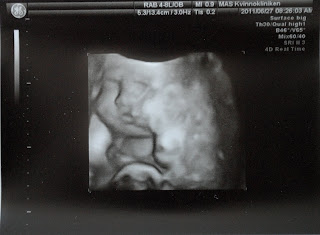 Som ni säkert förstår är ultraljudet höjdpunkten på v. 33. Jag kan inte riktigt slita mig från bilderna utan sitter och tittar och tittar och tittar. Vi dricker en kopp kaffe, studerar dem noga, in i minsta detalj. Det påminner lite om när Rs mormor berättade att hon satt med lupp och försökte se om det var en pojke eller flicka vi skulle få utifrån de första ultraljudsbilderna vi skickade till henne. Vi granskar varje millimeter, noga.